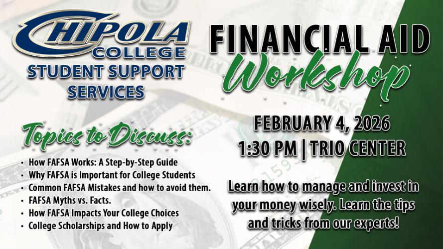 Chipola College Student Support Services (SSS) will host a Financial Aid Workshop on Wednesday, February 4, 2026, at 1:30 p.m.