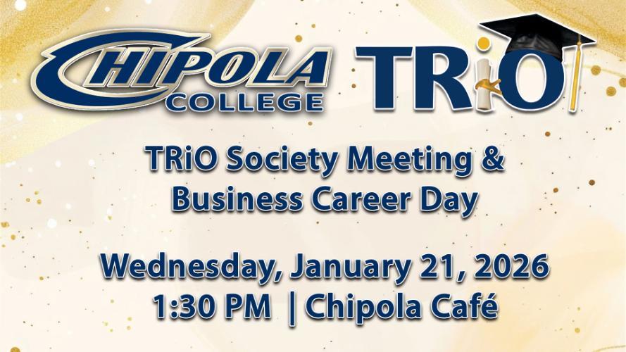 Chipola College’s TRiO Society will hold its monthly meeting and Business Career Day on Wednesday, January 21, 2026, at 1:30 p.m.