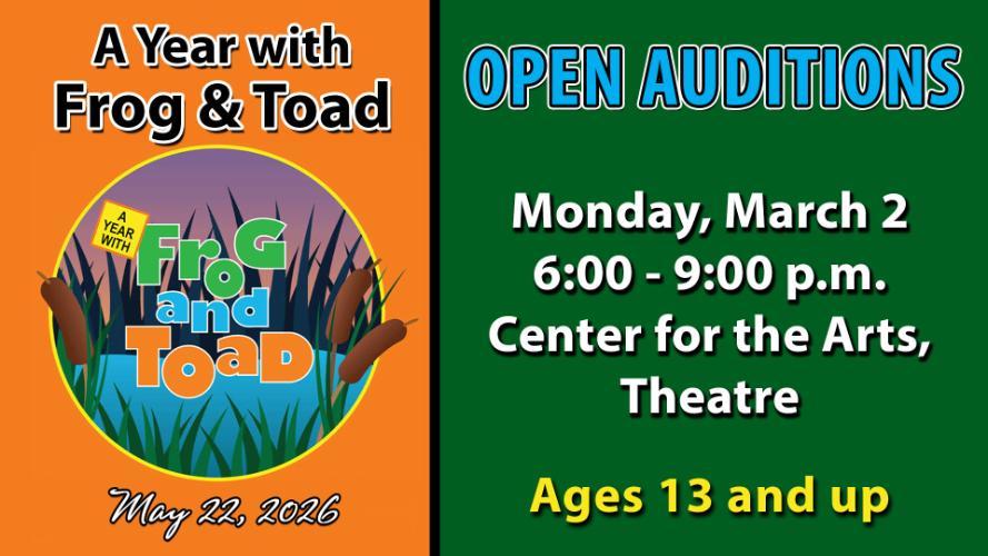 Chipola Theatre will hold open auditions for A Year with Frog and Toad on Monday, March 2, from 6:00 to 9:00 p.m. at the Center for the Arts