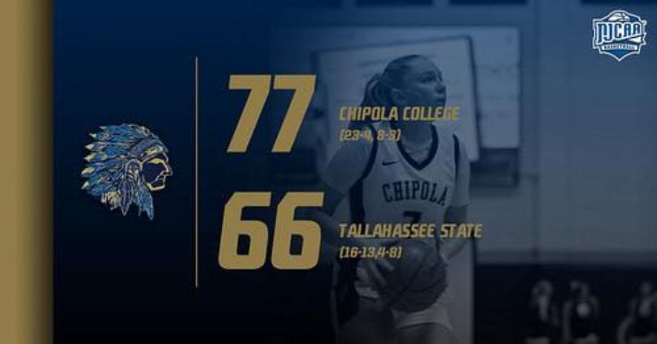 The No. 8 Chipola College Lady Indians earned a 77–66 victory over Tallahassee in conference play at the Milton H. Johnson Health Center.